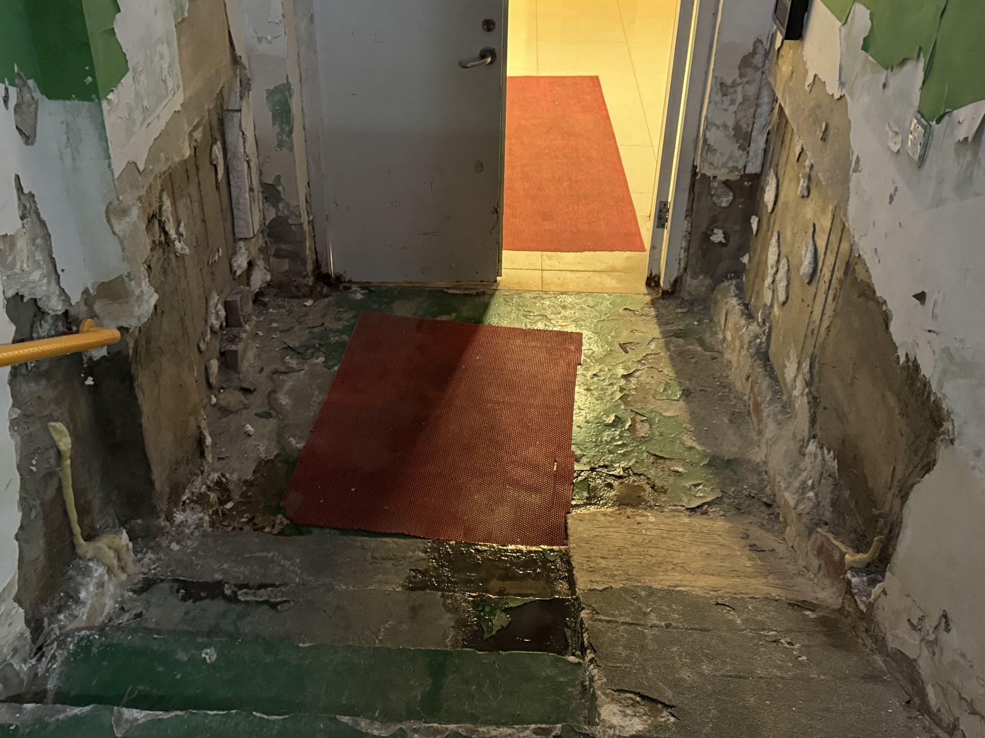 “打那儿之后,深坑被填上了,砸开的洞口安上了一扇门。”李女士递给记者一只口罩,随即推开大门。一股刺鼻难闻的潮气扑面而来,隔着口罩仍可闻到。如今墙后的深坑已被填平,变成了水泥地面。“坑只是被简单填上,积水的病根并没根除。这不,水又渗出来了。”站在曾经的深坑之上环顾四周,地面有大片水渍,墙壁大面积洇湿,屋顶上密密麻麻挂满水珠。