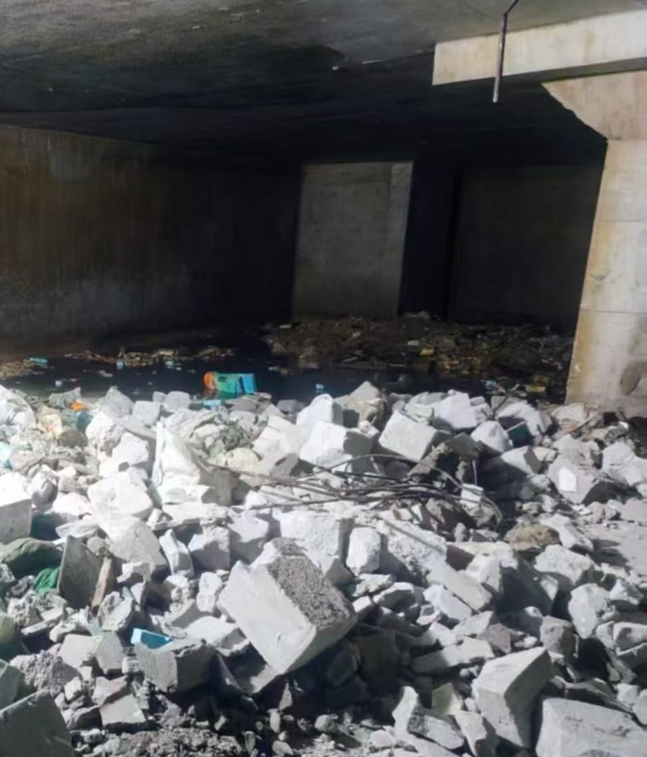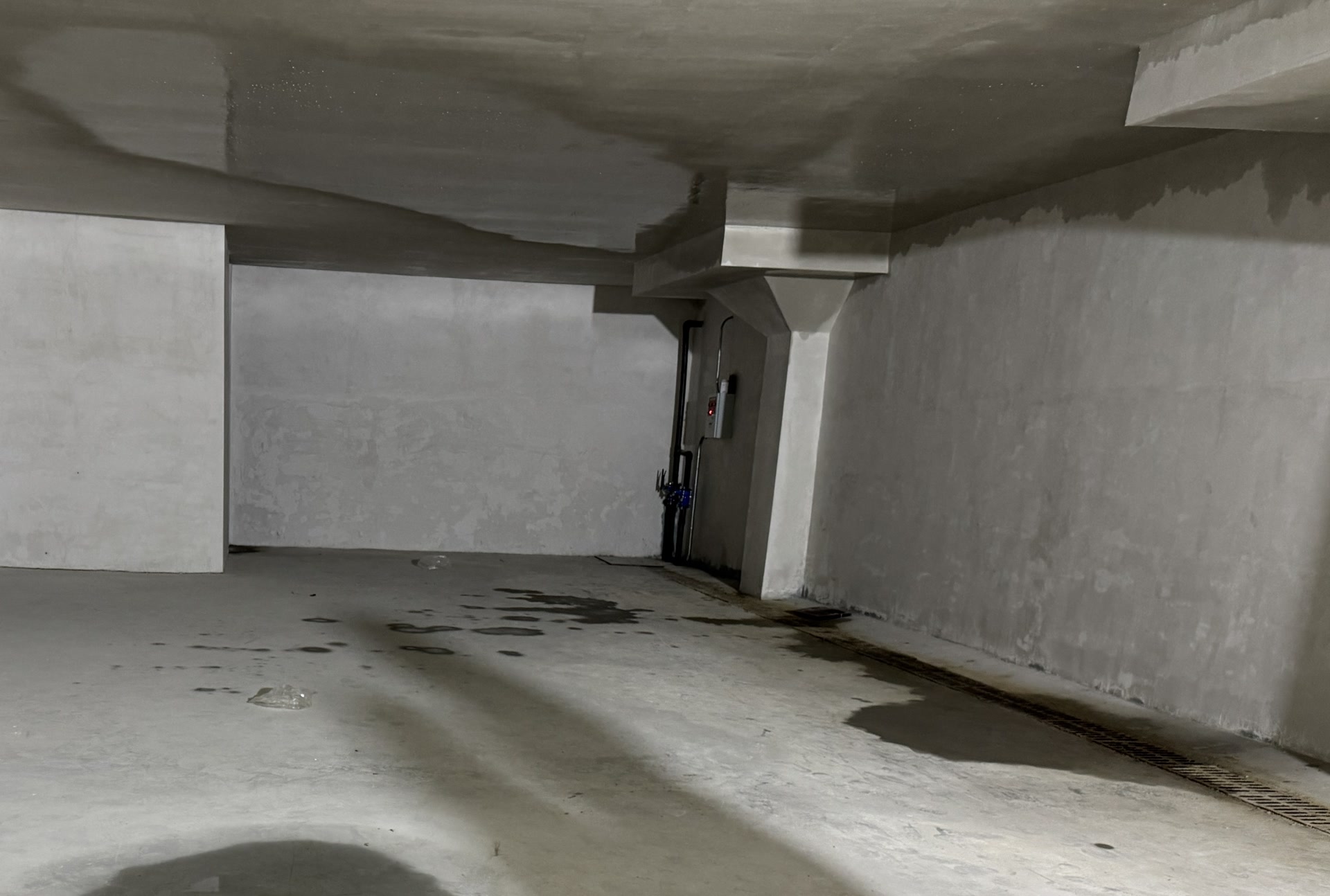据介绍,该小区2023年解聘了开发商物业,引入新物业。新物业工作人员表示,自从接手小区物业管理后,每年都下大力气治理渗漏,居民家中及其他公共区域通过修修补补已初见成效。但渗漏最严重的地库,仅靠物业小修小补难以根治。“渗漏主要来自大大小小的夹层。我们委托第三方治理连廊渗漏,用上了注浆等各种工艺,一直修不好,后来发现连廊两侧墙内存在空隙,里头的水用两台抽水泵抽了两天都没有抽干。设备机房的夹层连着居民家,因此夹层的积水还导致居民家渗漏。10号楼附近的地库通道后的‘密室’也是如此,近70平方米的大坑内水深五六米,挖掘机清掏积水和建筑废料时根本掏不到底。我们抽了3天水,实在抽不完,最后只能用土夯实、搭上框架,将其填平。可这并不意味着里边没水了,只是像鱼缸一样把水包了起来。”