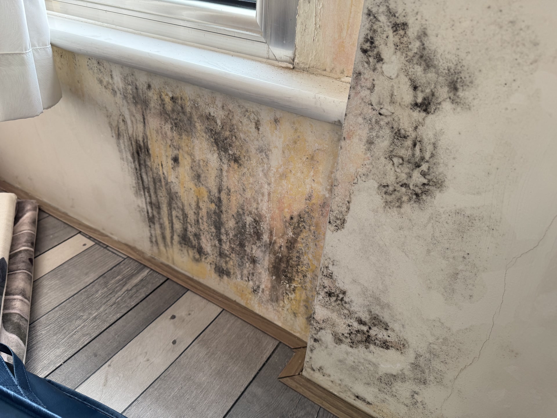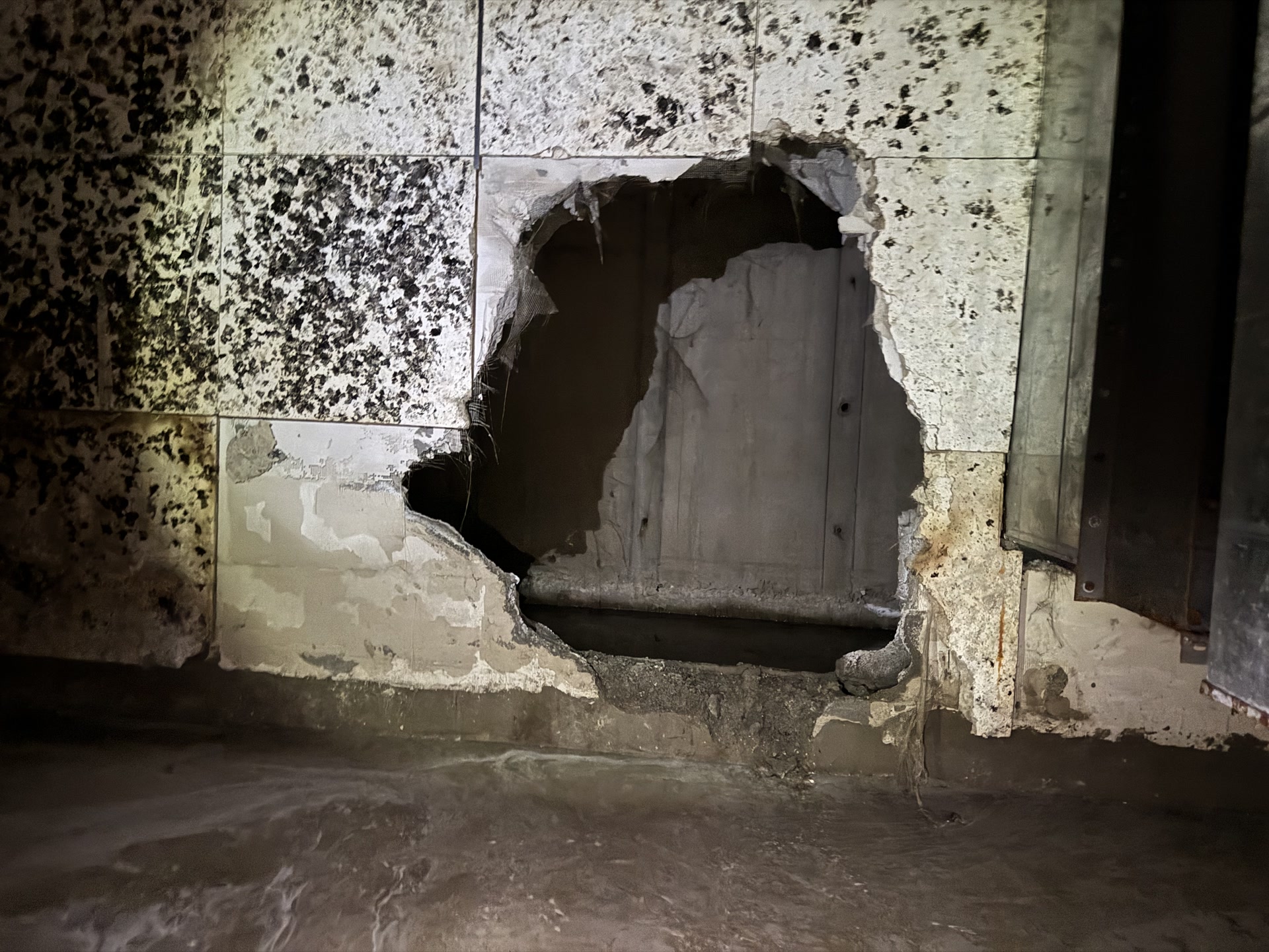 更严重的渗漏是在设备机房。刚迈进设备机房的门,记者便一脚踩进水坑。只见地面一片潮湿,墙壁和屋顶布满黑色霉斑,最里侧的墙壁被砸开一个大洞。打着手电往洞里望去,墙内有一个四五平方米的夹层,里边存着十多厘米深的积水。
