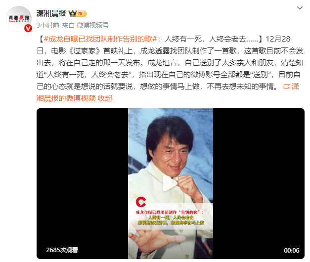 12月28日,电影《过家家》首映礼上,成龙透露找团队制作了一首歌,这首歌目前不会发出去,将在自己走的那一天发布。成龙坦言,自己送别了太多亲人和朋友,清楚知道“人终有一死,人终会老去”,指出现在自己的微博账号全部都是“送别”,目前自己的心态就是想说的话就要说,想做的事情马上做,不再去想未知的事情。